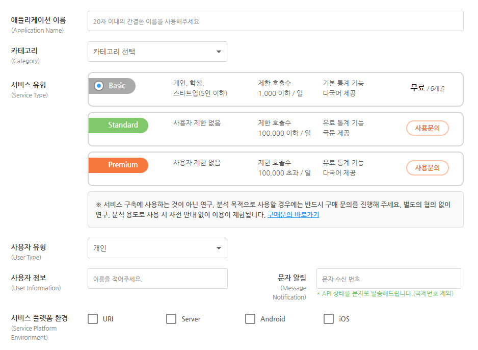 서비스 유형에 따라 애플리케이션 등록 완료 시 바로 서비스 이용이 가능하거나 별도 문의가 필요한 유형이 있습니다.